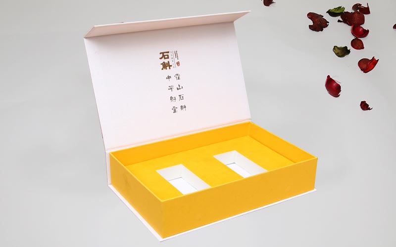1.材质:盒子面纸用157G铜版纸 单面彩色印刷,单面哑膜裱1300G双灰板,盒子内托用白色EVA开模,两款包装盒的盒型结构为翻盖盒,简单精致上流水线制作。