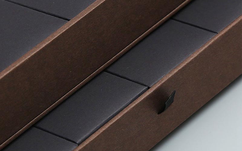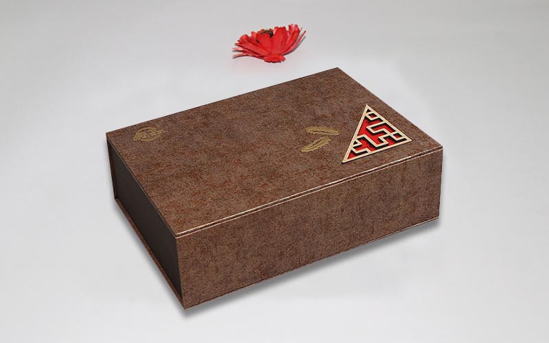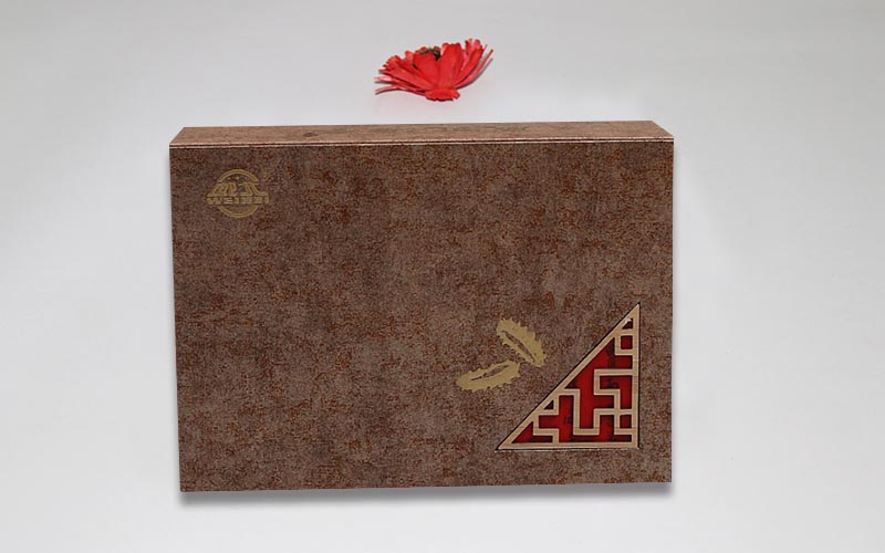 1.质材:盒子用棕色特种纸表面图标烫金,击凸,右下角贴镂空贴内衬纸外粘三角新木框。裱1500G双灰板,盒子盒型为双层抽屉,内托用黑色内卡纸做成小卡盒里面装重要产品。盒子粘黑色丝带整款盒子手工制作。